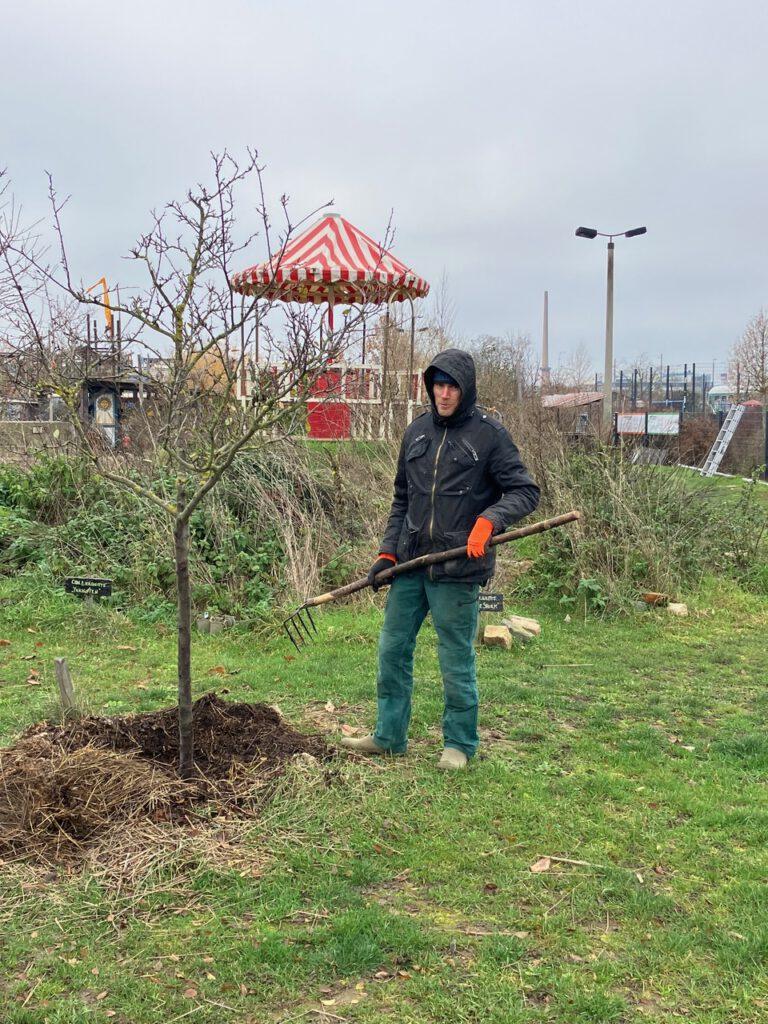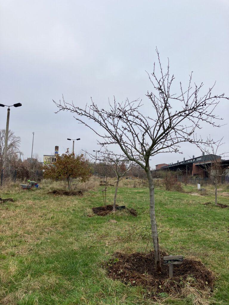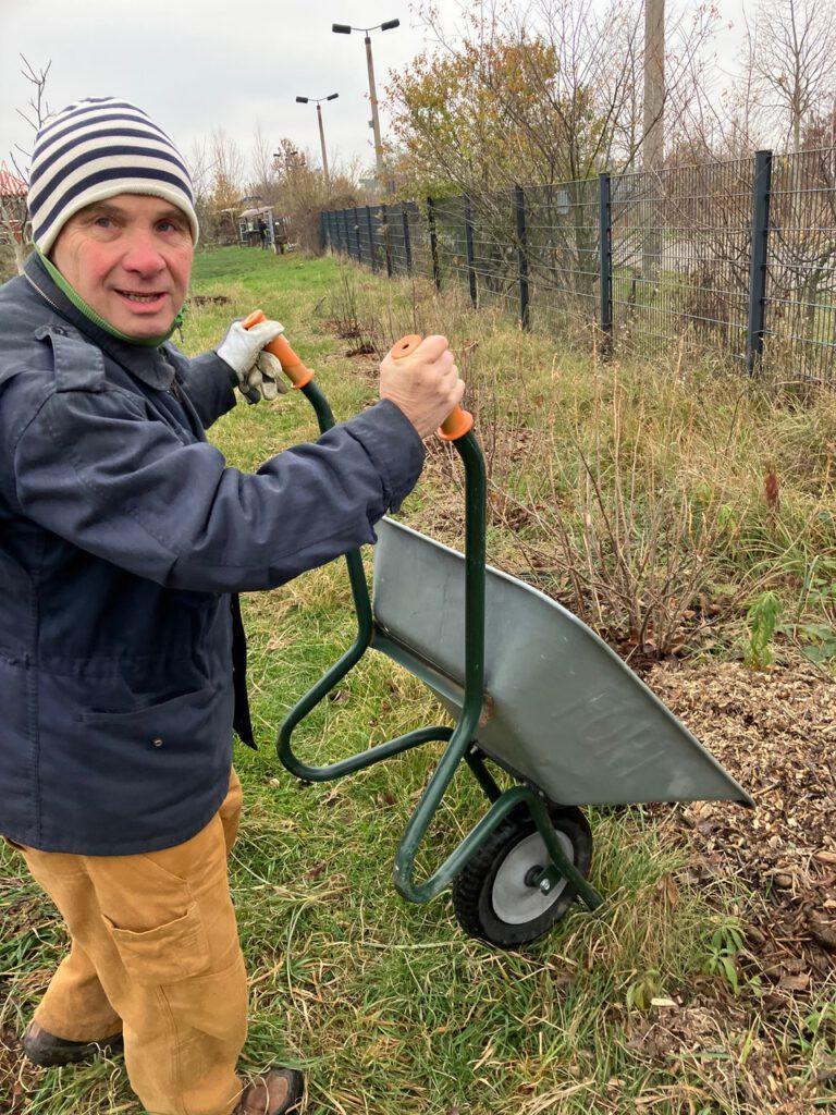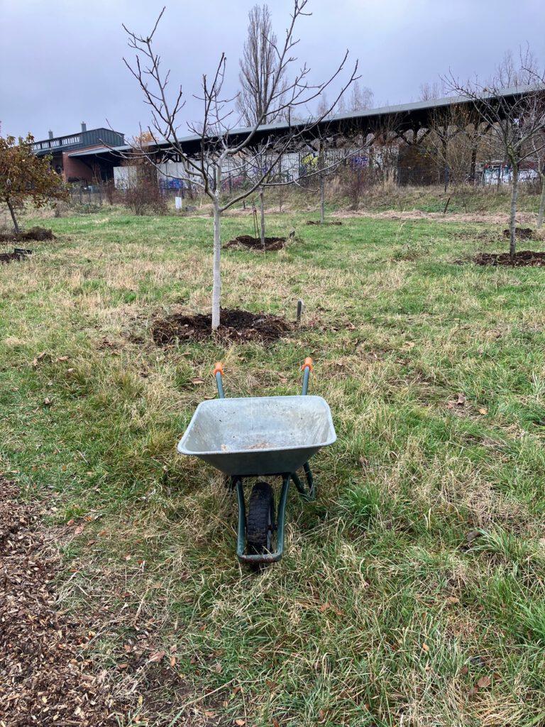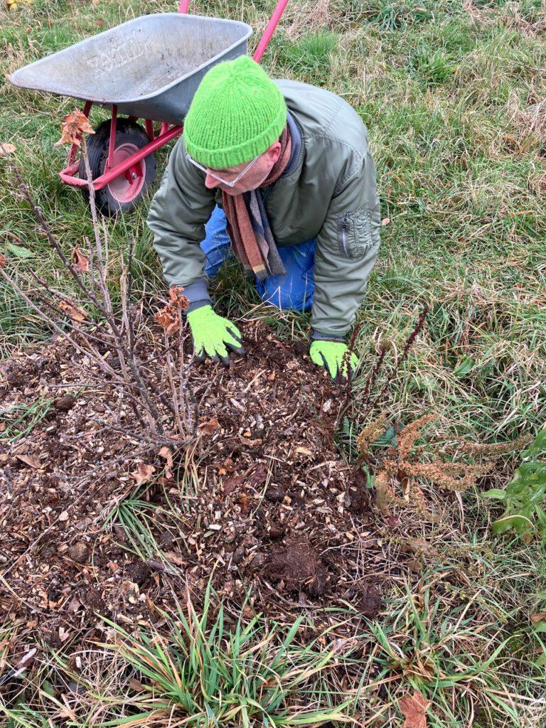 Die letzten Tage im November haben wir mit der Winterpflege unserer Obstwiese zugebracht. Neben den Baumscheiben, die Pferdemist und Hackschnitzel zum Mulchen bekamen, wurde die neue Hecke und auch die Beerenobstreihe breit gemulcht. Wir machen jetzt schon seit zwei Jahren Bodenverbesserung im Obstgarten und bringen Nährstoffe ein, da uns auffiel, dass unsere Bäume und Sträucher nicht so gut ins Wachsen kamen. Auch wenn wir kein Ertragsgarten sind, legen wir Wert auf mehr Pflanzengesundheit und Artenvielfalt unseres noch jungen Biotops.