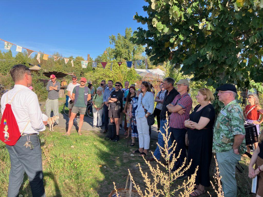 Gemeinsam mit ca. 60 Gästen machten wir einen Rundgang über die Projektflächen und zeigten am 19.09.2025, was in den vergangenen 10 Jahren alles auf dem Bürgerbahnhof Plagwitz geschafft haben. Wir richteten dabei den Blick von der Vergangenheit in die Zukunft. Stationen waren mit Toralf und Wilfried die Initiative Bürgerbahnhof Plagwitz (IBBP), mit Michael für den Obstgarten Plagwitz, mit Agnes und Nina für das Kulturcafé heiter bis wolkig, mit Moritz und Stephan vom Bauspielplatz, mit Agnes und Friedericke vom Hildegarten und mit Ulrike und Denis für die Bürgerinitiative Bahnhof Plagwitz.