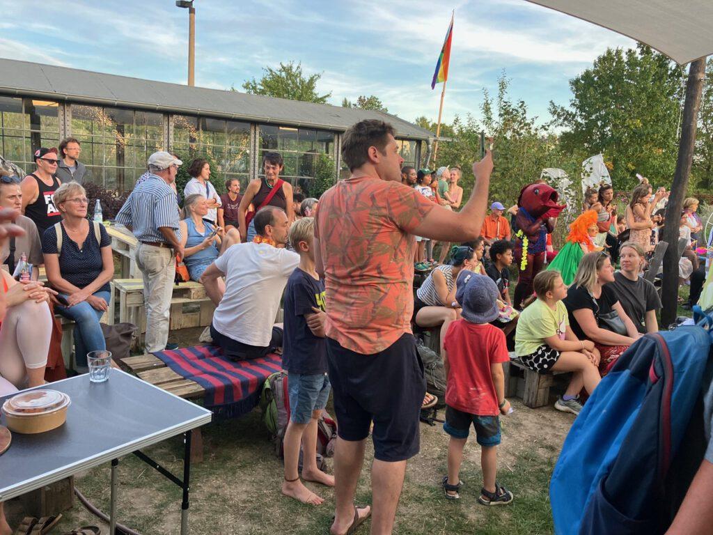 Wir können auch Spielen und es hat ungeheure Freude gemacht. Am Samstag den 20.09.2025 landete auf dem Bürgerbahnhof Plagwitz ein Schiff. Bei der musikalisch-performative Inszenierung im Paradies, die mit einer Expedition und einen wahrhaftigen Landgang im Hildegarten erfolgte, waren ca. 120 Gäste anwesend. Die Einweihung des Wagons wurde mit einem spektakulären Feuerwerk gefeiert.