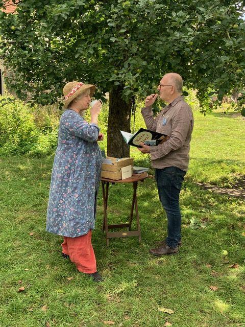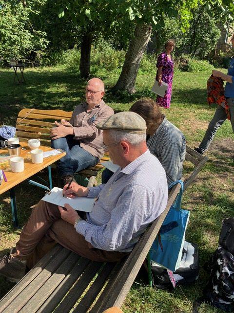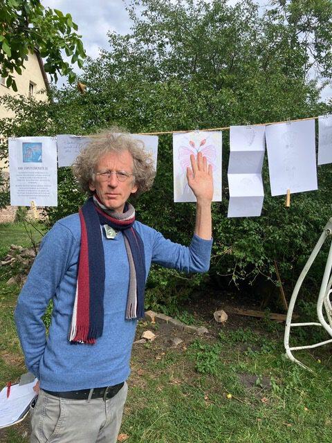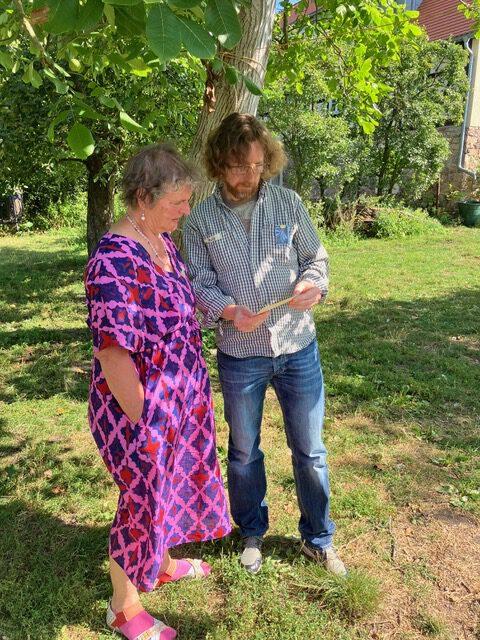 Begleitet wurde diese Resonanzreise in die Natur von der Künstlerin und Kunstvermittlerin Dorit Löffler und dem Poeten, Performer und Philosophen Rainer Totzke (aka Kurt Mondaugen) sowie dem Bildungsreferenten und Streuobstfachwirt Michael Berninger. Sie sind auch selbst als künstlerische Forschende aktiv und haben das Projekt „Vom Verschwinden – zur Poesie und Philosophie der Insekten“ initiiert.