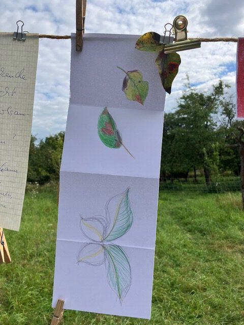 Wir waren am Sonntag, den 24.08.2025, zu Gast in der Lobelei mit einem künstlerischen Workshop zur Poesie von Pflanzen und Insekten. Die Lobelei ist ein Hofprojekt (Wohn- und Seminargebäude) in Lobstädt, einen wunderschönen Ort in der Pleißenaue zwischen Neukieritzsch und Borna gelegen. Die 10 Teilnehmenden wurden zum Forscherteam und erschlossen sich die Streuobstwiese hinter dem Hof gemeinsam mit den am Hof ansässigen Hühnern und Enten. Die Lobelei war für uns der ideale Ort zum Beobachten, Erfahren, Verstehen und Gestalten. Im Workshop erkundeten wir die Natur und experimentierten mit Farbstiften, Klemmbrett, Stoffen, Kuli und Papier.