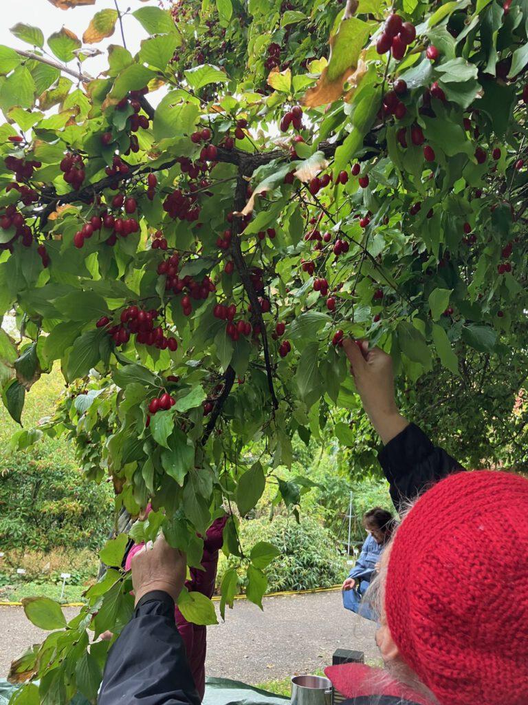Am Samstag, den 04.10.2025 kamen 10 Personen zu unserer Workshopreihe Wildobst, die wir seit Jahren gemeinsam mit den Botanischen Garten veranstalten. Alles zusammen mit Ernten, Verarbeiten und Verkosten steht im Mittelpunkt des Workshops. Die Kornelle ist keine Kirsche, auch wenn die Früchte so aussehen, sondern ein Hartriegel. Gesunde Ernährung und insektenfreundliche Pflanzen passen gut zusammen und wir haben das ganz mit einer Portion Wissensvermittlung angereichert. Danke an Cindy vom Botanischen Garten und den Obstgenossen Michael vom Landschaftspflegeverband für den genussvollen Vormittag. Das Ernten ist im September bzw. Anfang Oktober möglich und im Garten stehen auch 2 große Hartriegel. Wichtig – im Botanischen Garten nicht selber Pflücken sondern nur mit Erlaubnis. Im Stadtraum stehen auch manche Kornellen und mit Hilfe der App bzw. Webseite von Mundraub sind diese auch zu finden https://mundraub.org/