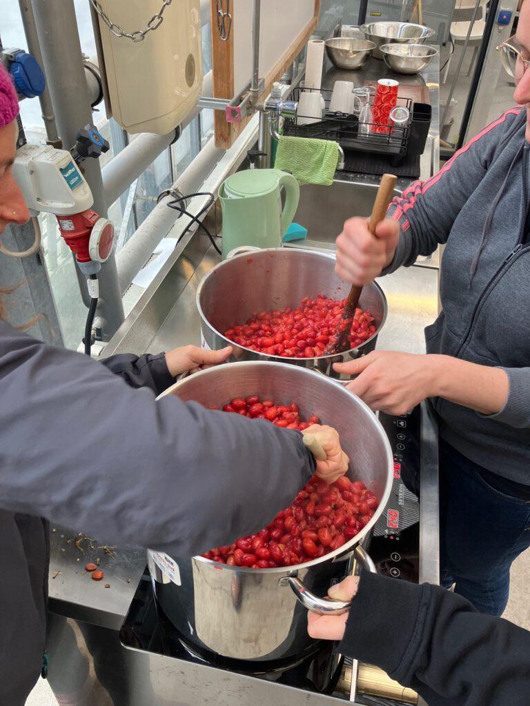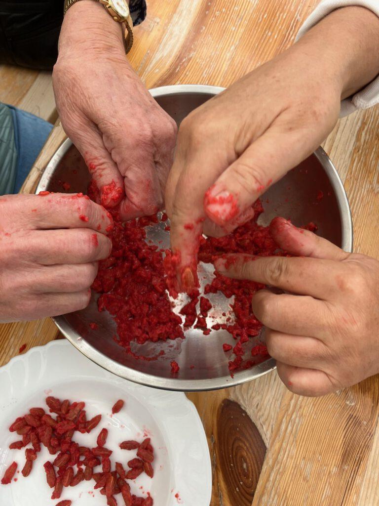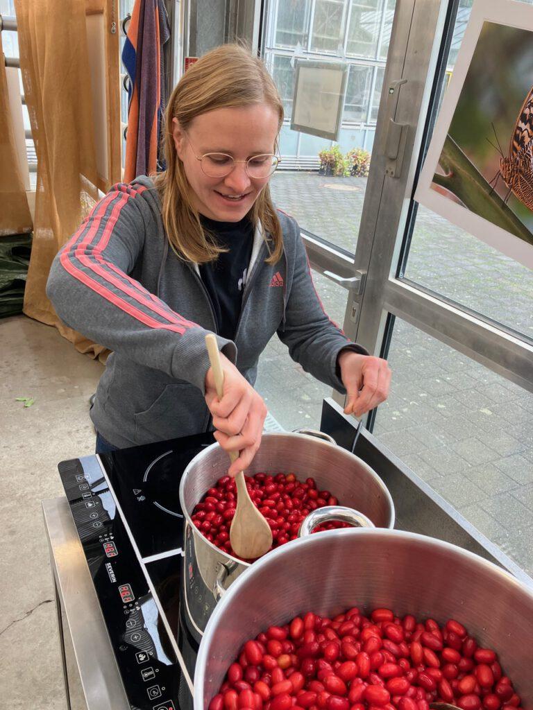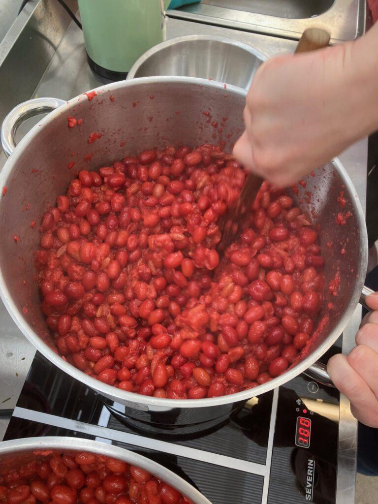 Beim Verarbeiten war das Ganze schon nicht mehr so einfach und wir hatten richtig Mühe, das Fruchtfleisch von Kern zu bekommen. Ehrlich gesagt, küchentauglich ist die Kornelle nicht, das haben wir an diesen fruchtvollen Vormittag erleben können, aber einige Gläser für den eigenen Hausgebrauch konnten die Teilnehmenden dann doch mit nach Hause nehmen.